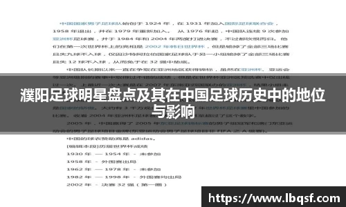 本文旨在对濮阳足球明星进行全面盘点,探讨他们在中国足球历史中的地位与影响。首先,文章将介绍几位代表性的濮阳足球运动员,包括他们的成长经历和职业生涯亮点。其次,将分析这些球员如何推动当地足球的发展,并对中国足球的整体格局产生影响。然后,我们将讨论濮阳足球文化的形成及其对未来人才培养的重要性。最后,本文...
